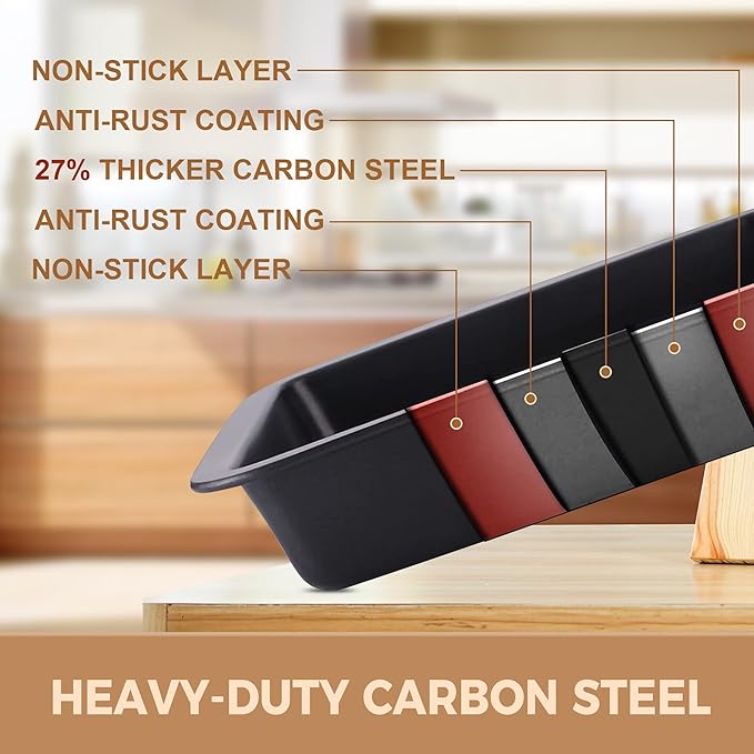 - PREMIUM EXTRA-THICK MATERIAL - With 27% thicker carbon steel, this durable baking sheet set for the kitchen is constructed from heavy-gauge carbon steel for stability, even heat distribution, and durability for years to come. Warranty against peeling off with heat-resistance temperature: 450℉