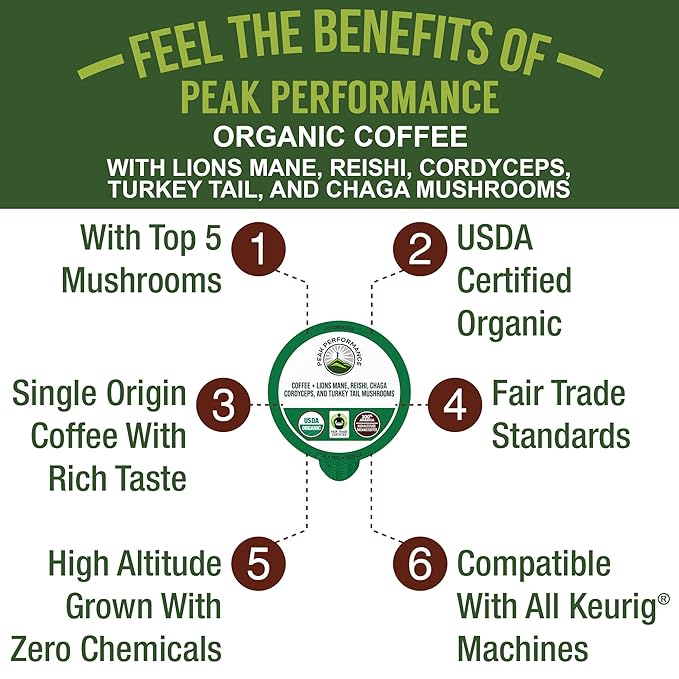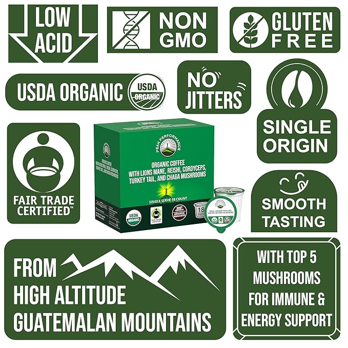 - Compatible With All Devices - 100% Recyclable Coffee Pods - Fair Trade - Low Acid - USDA Certified Organic - Single Origin - High Altitude Guatemalan Coffee Pods carefully infused with Lion's Mane, Reishi, Cordyceps, Turkey Tail, Chaga Mushrooms for immune support, energy, performance, and brain boost without the jitters.