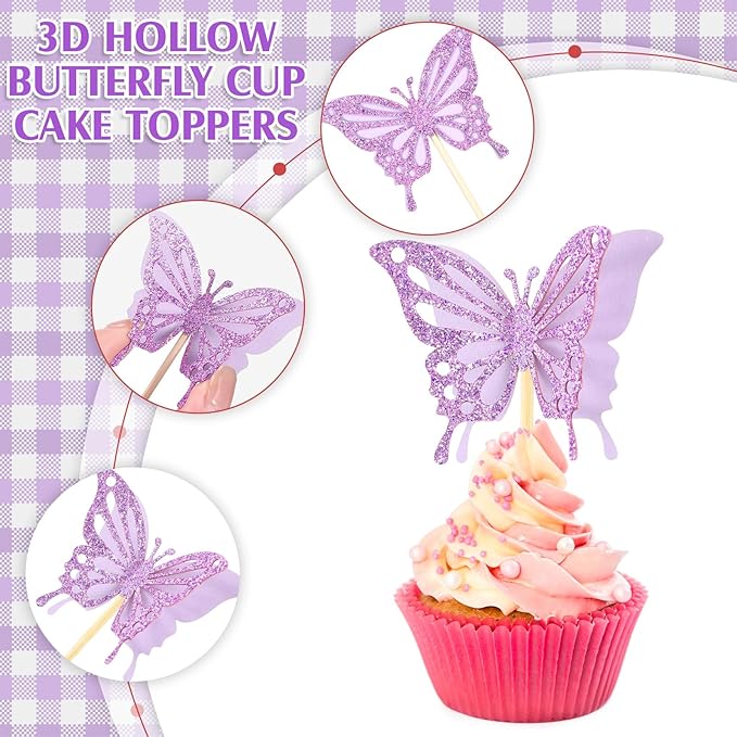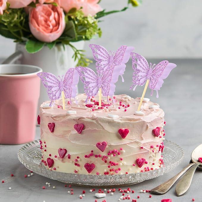 Chinco 48 Pcs Butterfly Cupcake Toppers Assembled Double Layer Cupcake Topper 3D Glitter Cake Topper Butterfly Cocktail Pick Decoration for Baby Shower Birthday Wedding(Glitter Purple,Retro Style)