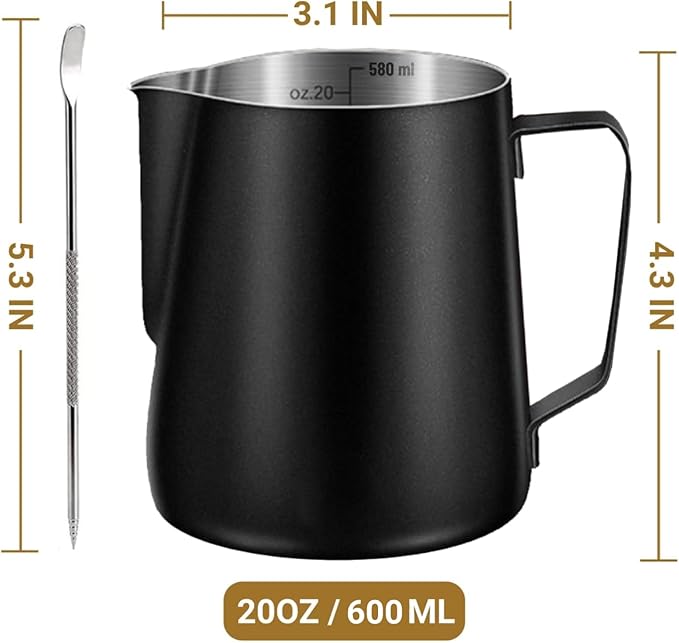 - 【Humanization Design】Double scale lines can help you accurately control the pouring speed and volume of liquid. Equipped with a latte art pen, you can design beautiful coffee patterns. Ideal for foaming or steaming milk, used in espresso and cappuccinos.
