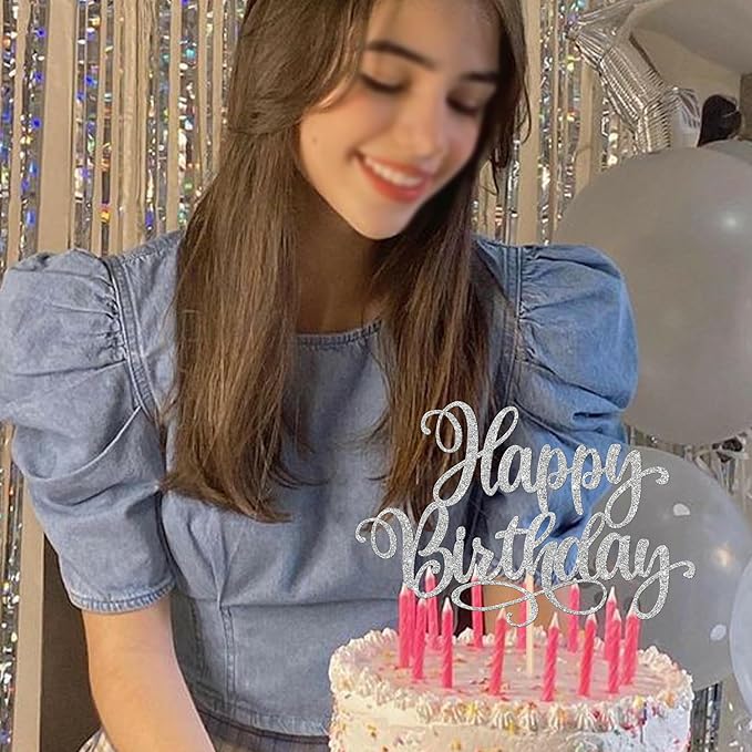 ZHUOWEISM 1 PCS Happy Birthday Cake Topper Glitter Happy Birthday Cake Pick for Celebrating Happy Birthday Anniversary Party Cake Decorations Supplies Silver