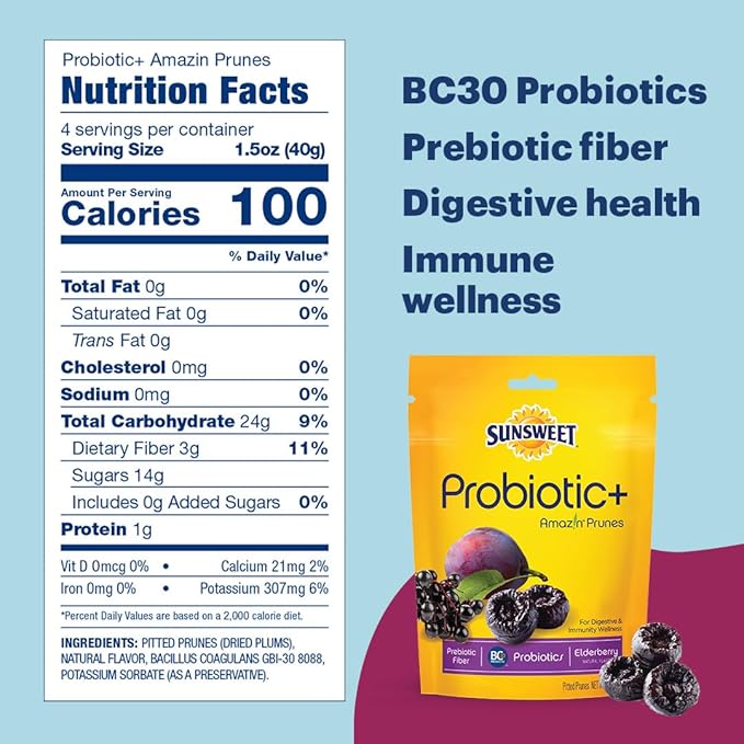 - Probiotic Prunes - With BC30 Probiotics and prebiotic fiber, our gut health-nourishing elderberry flavored Probiotic+ Pitted Prunes are here to give you a whole lot more to feel good about.
