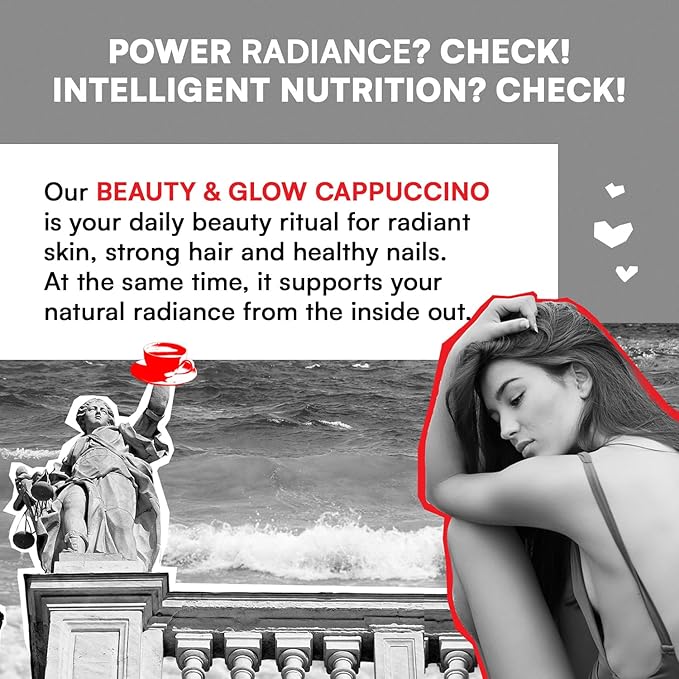 - NUTRIENTS FOR YOUR GLOW: With Vitamin C, Biotin & Zinc, this Beauty & Glow Cappuccino helps your skin to regenerate naturally. Vitamin C protects against free radicals and stimulates Collagen production, while Biotin & Zinc strengthen skin, hair and nails.