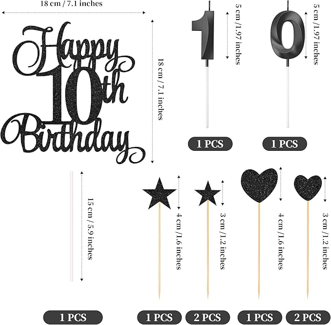 - Package content: you will receive 1 piece happy 10th birthday topper, 3 pieces star cake toppers, 3 pieces heart cake toppers and 2 pieces numeral candles, it's a great addition to the 10th birthday party and anniversary party