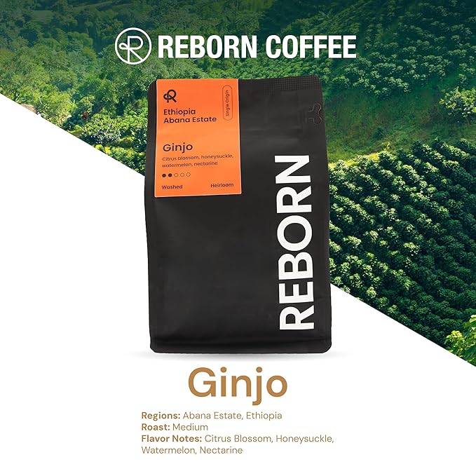 Reborn Coffee Specialty Whole Bean Coffee, Light-Medium Roast, 12 Ounce, Ethiopia Abana Estate Ginjo, Notes of Citrus Blossom, Honeysuckle, Watermelon, and Nectarine