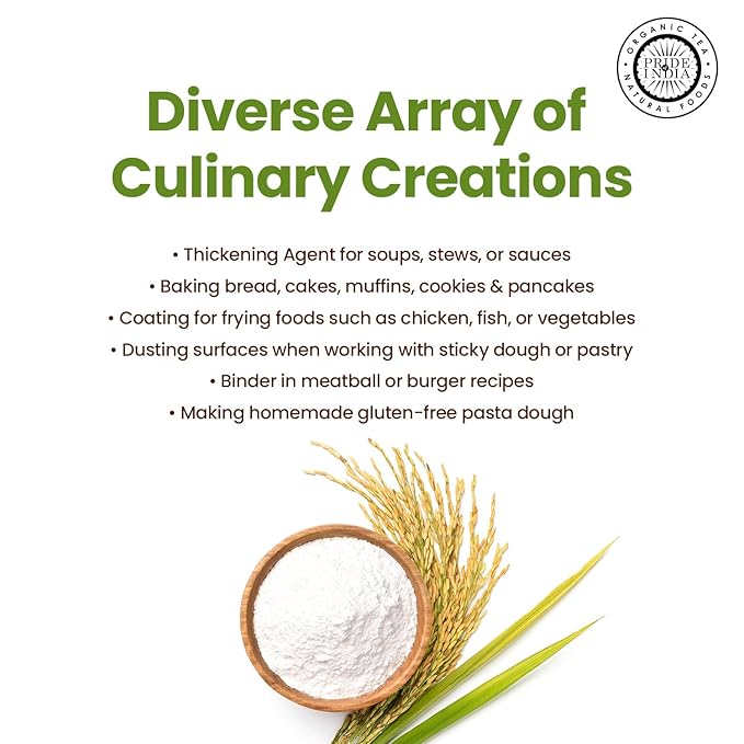 - Finest Quality Our Promise: Elevate your culinary creations with the unmatched quality of Pride of India's White Rice Flour, meticulously milled to perfection with a focus on freshness and excellence. Sourced from premium white rice grains, our flour undergoes careful processing to ensure optimal flavor and nutritional integrity in every batch. Perfect for gluten-free baking, cooking and thickening sauces, our flour offers a versatile addition to your kitchen repertoire.