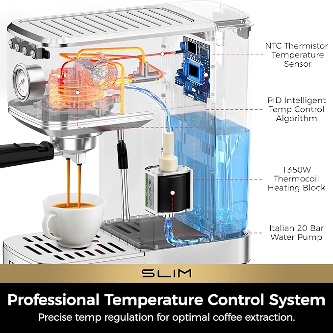 - Professional Pump: Come with 20 bar original Italian pump for easily extract strong flavored and rich crema espresso; Fast Heating: 1350 watts powerful boiler, preheating in just 30 secs, lets you make a delicious espresso in 1-3 mins