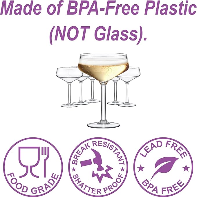 Amazing Abby - Courtney - 12-Ounce Plastic Coupe Glasses (Set of 6), Martini Glasses, Champagne Saucers, Reusable, BPA-Free, Shatter-Proof, Dishwasher-Safe, Perfect for Poolside, Outdoors, and More