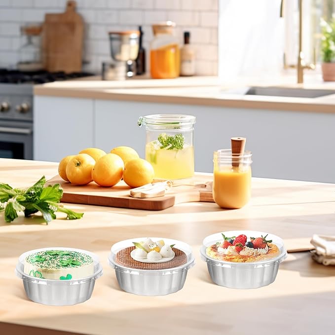 - Convenient for Serving Crowds --- Designed for serving a crowd, these aluminum pie pans are colorful, unbreakable and disposable, which can work great for gatherings or different parties. Each cup with a lid can be cooked in different kinds of dessert, serving well for individual taste.