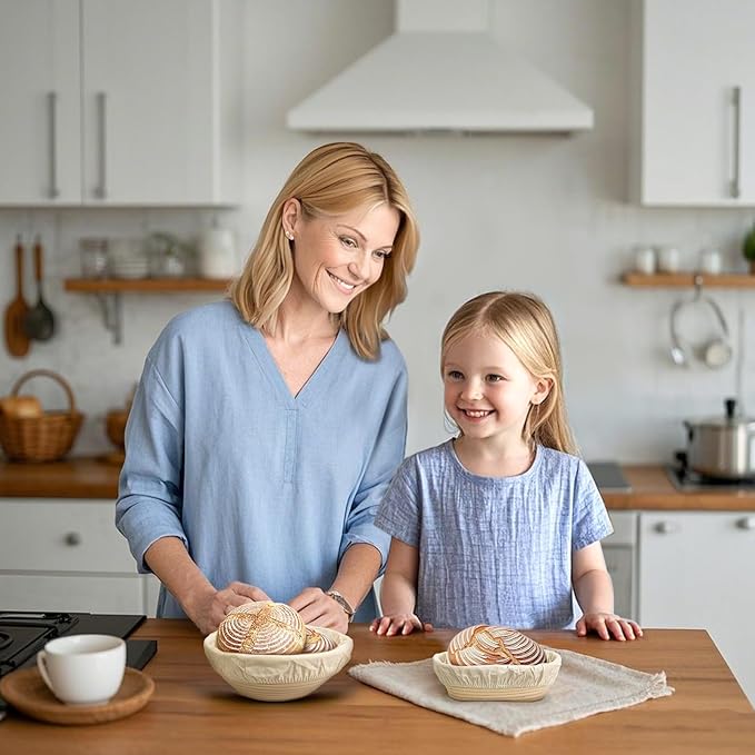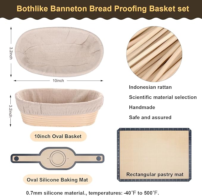 - [Practical Complete Baking Tools ] This meticulously designed set of sour dough kit is practical and multifunctional. Sourdough starter kit includes two 10-inch oval sourdough proofing basket, each with a liner, a danish dough whisk, a silicone baking mat, a silicone bread sling, a cleaning brush, a metal dough scraper, a plastic dough scraper, Bread Lame , and 5 replaceable blades, ensuring you have everything you need to enjoy baking.