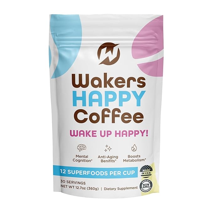 Wakers HAPPY Coffee supports energy, focus, anti-aging, and metabolism. Made in the USA with natural ingredients and Keto-friendly. Reminding you to wake up happy!