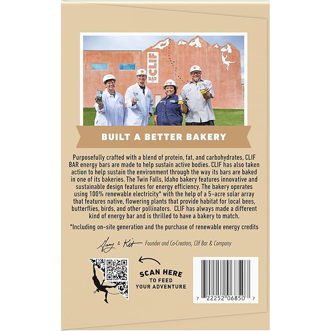 - CRAFTED WITH PURPOSE: CLIF BAR energy bars are made in 2 LEED certified bakeries that use renewable electricity including on-site generation and/or the purchase of renewable energy credits (RECs)