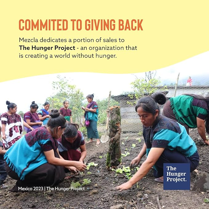 - EACH BAR GIVES BACK: Mezcla is dedicated to making a positive impact in communities around the world. Partnering with The Hunger Project, a global non-profit committed to ending world hunger by 2030, Mezcla donates a proceed of bar sales to support their efforts.