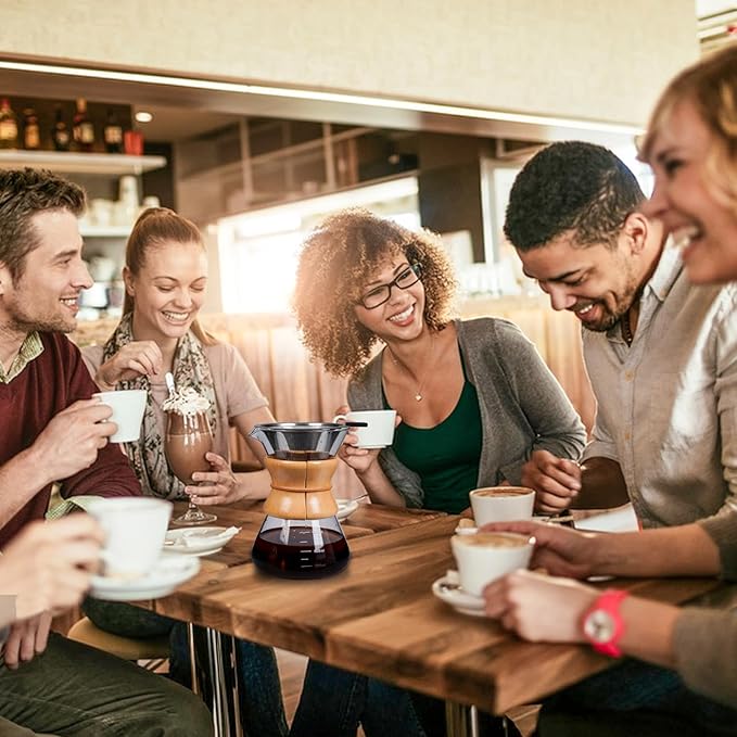 Pour Over Coffee Maker with Reusable Stainless Steel Drip Filter, Lead-Free Borosilicate Glass Coffee Carafe with Modern Wooden Collar for 1-6Cup, Circular Clear (800ml/27oz)