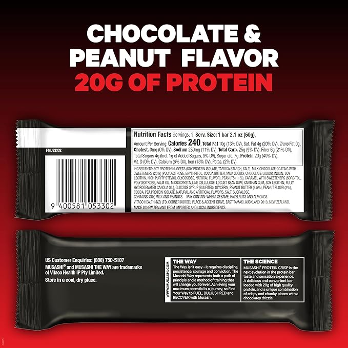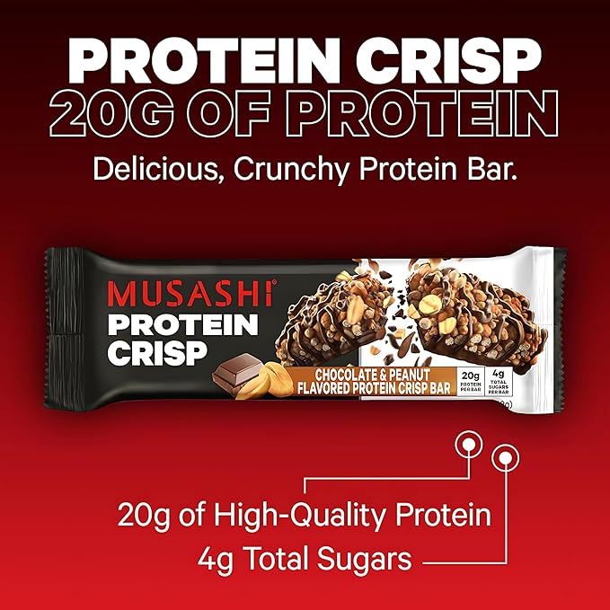 MUSASHI Protein Crisp Bar, 20g Protein, 4g Total Sugars, Chocolate & Peanut, Post Workout and Snack On The Go, 12 Pack of 2.1oz (60g) Bars