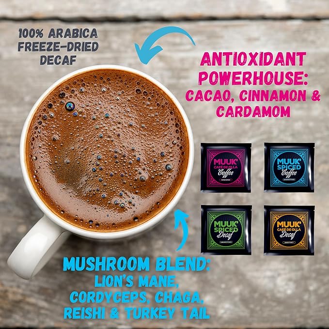 MUUK' SUPERFOODS | Mushroom Coffee Starter Kit | Instant Coffee | Caffeinated & Decaffeinated - Sweetened & Unsweeetened | Spices & Adaptogen Mushroom Blend | Better Focus, More Energy and Stronger Immune Defense | 4 Boxes (10 cups each)