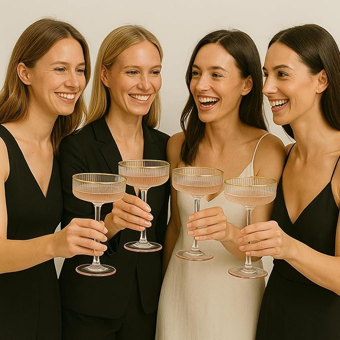 Khen Ribbed Vintage Art Deco Coupe Glasses - Martini, Champagne & Cocktail Ribbed Glasses 8oz | Crystal Ripple Goblet Glassware Set, Pink Gilded, 4 Pieces, Housewarming Gift