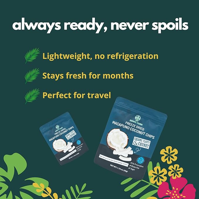 - Portable & Non-Perishable: Lightweight, resealable packs of freeze-dried fruits require no refrigeration. They stay fresh for months. Toss a pack of dried coconut shreds in your bag for hikes, road trips, or desk snacks, so you’re never caught snack-less.