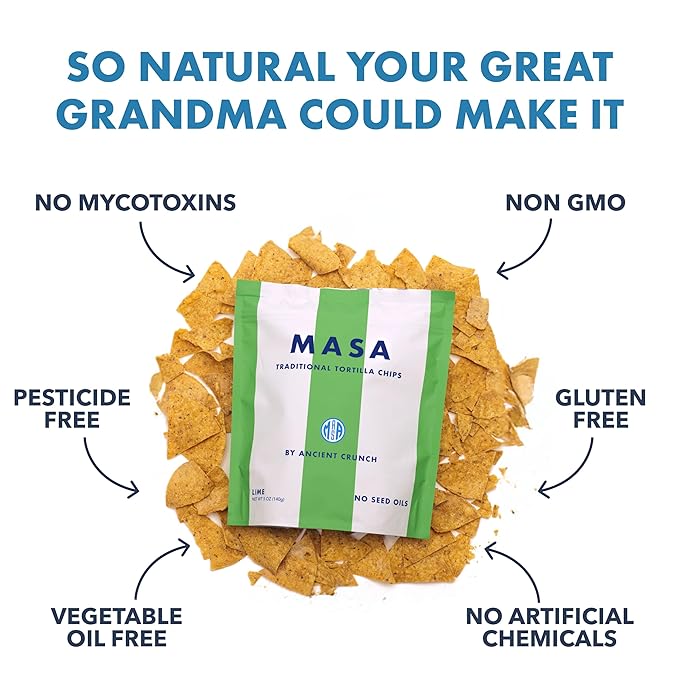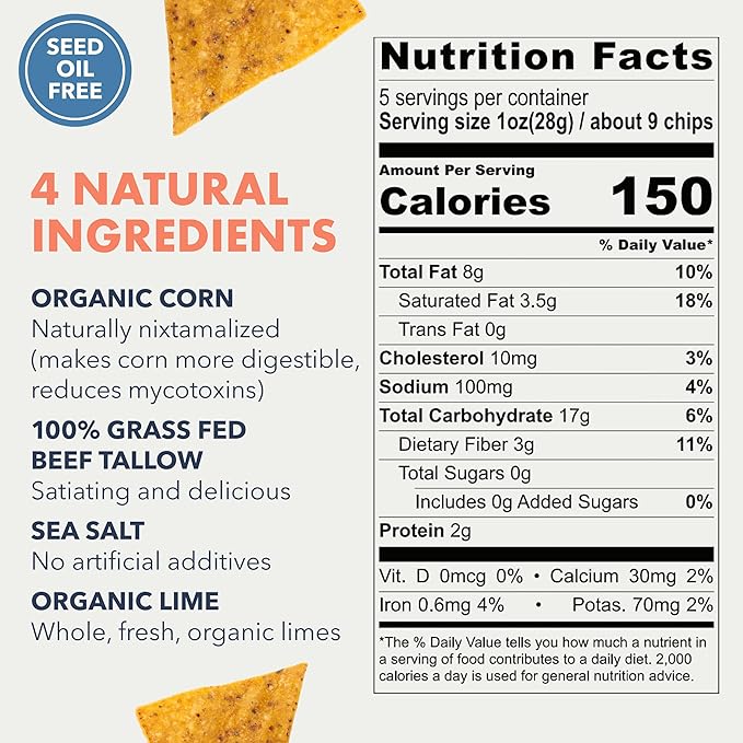 - Real, Good-For-You Ingredients - Our corn tortilla chips are completely handmade in small batches using seed oil-free ingredients. These GMO-free snack chips are made exclusively with naturally harvested corn, grass-fed tallow, and sea salt.