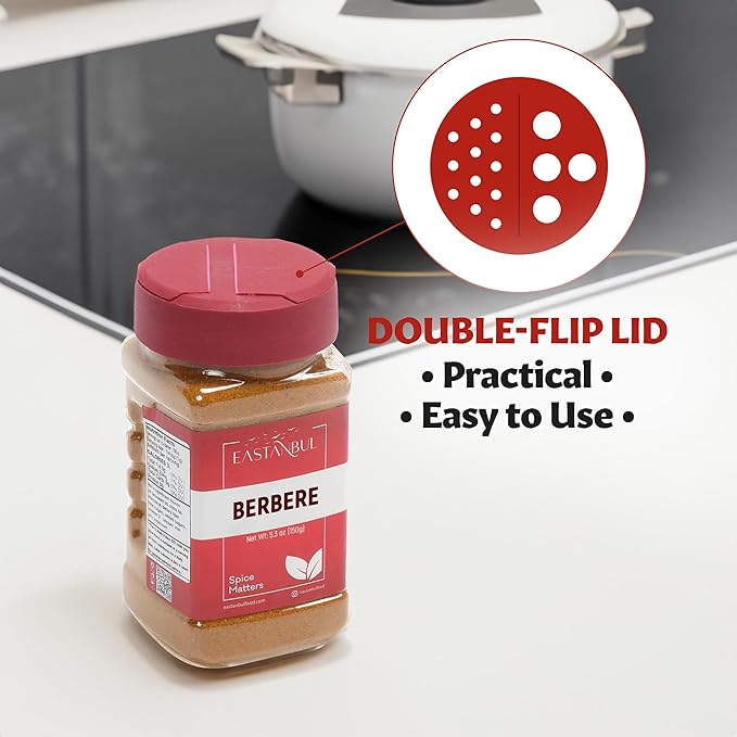 - EXOTIC BERBERE🔥 Vibrant turmeric and fiery chili powder ignite the blend, while paprika🌶️ and allspice introduce a smoky sweetness. Cumin and coriander lend an earthy richness, perfectly balanced by the bright zing of fenugreek. Garlic and onion🧄🧅 ground the mix