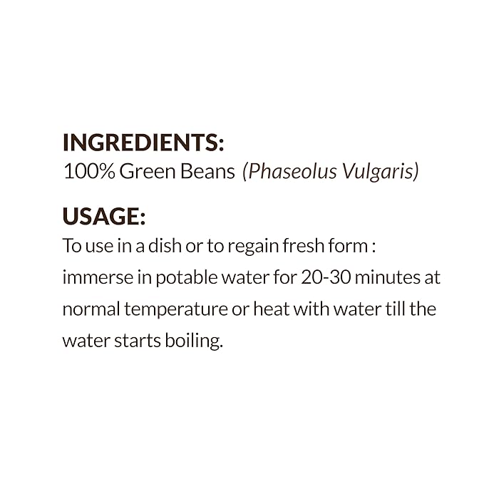 - How Many Serving?: Each 50g (1.76 oz) pack of SHROOTS Dehydrated Chopped Green Beans Flakes contains approximately 5 servings, with a standard 10g serving size, making it easy to add the right amount to your meals. These ready-to-use flakes are gluten-free, vegan, and contain no added salt or preservatives, offering a pure and healthy choice to enhance your dishes.