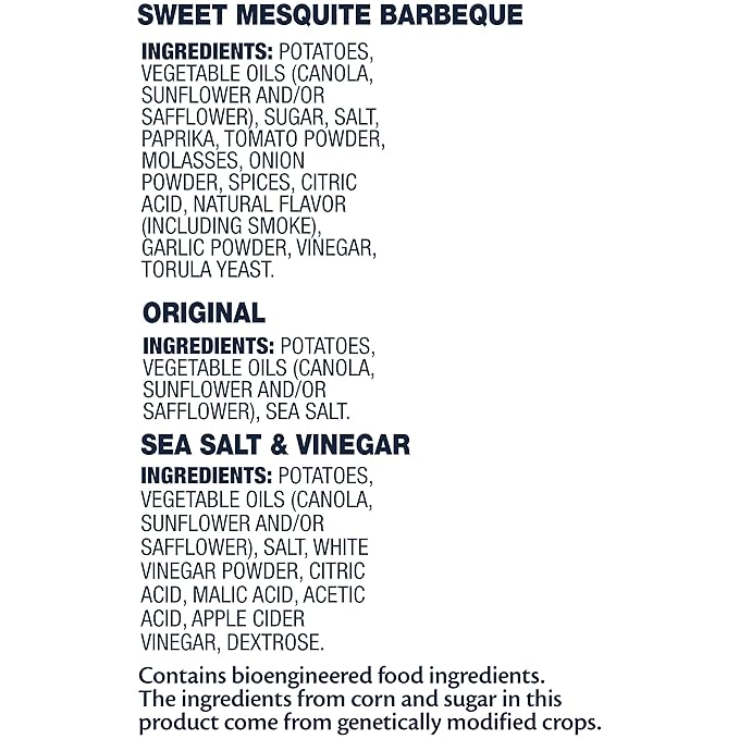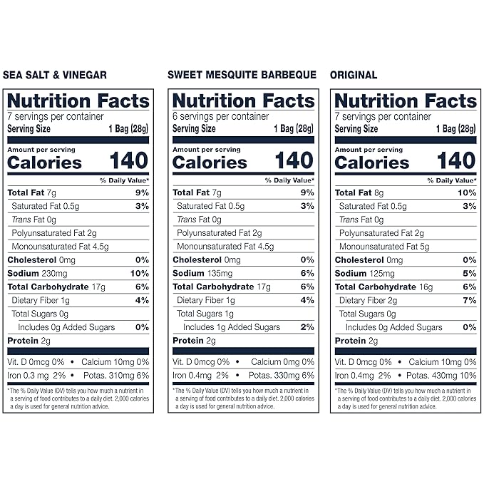 - Top flavors: includes 7 bags of sea salt & vinegar, 7 bags of original and 6 bags of sweet mesquite barbeque chips