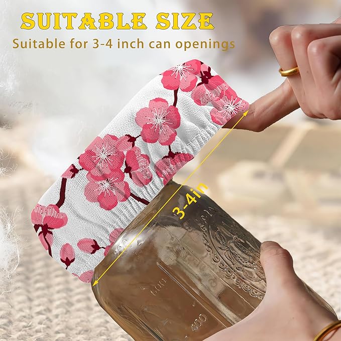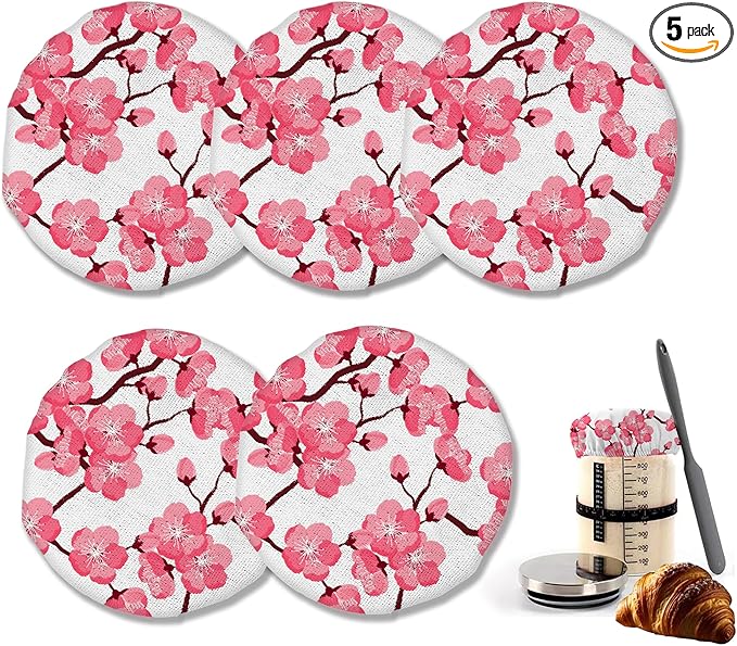 Sourdough Starter Jar Cloth Covers, Japanese Cherry Blossom Gifts for Women Baker 5 Pack Kit Stretchy Cloth Lids Fits Jar Mouth Ranging 3"- 4" Inches