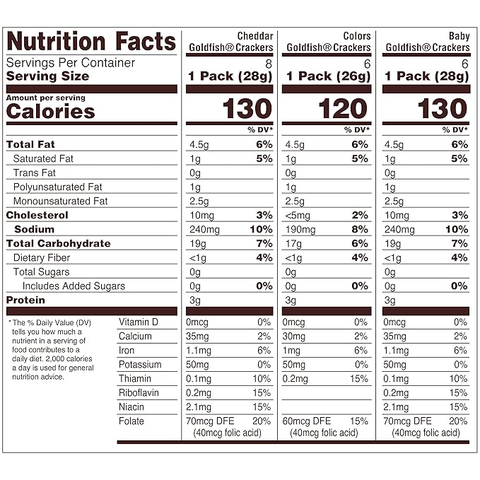 - VARIETY PACK INCLUDES 8 single-serving packs of Goldfish Cheddar, 6 packs of Goldfish Colors and 6 packs of Goldfish Baby crackers.