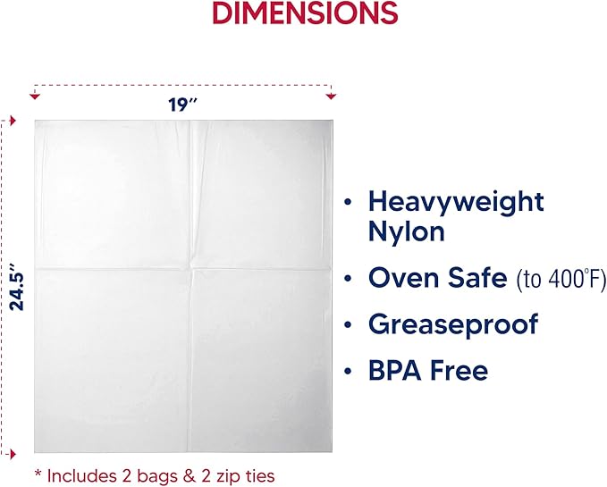 - Heavyweight BPA-free nylon (0.025mm thick); greaseproof and high-heat oven safe (to 400-degrees Fahrenheit); 2 bags (19 x 24.5-inches) and 2 zip ties