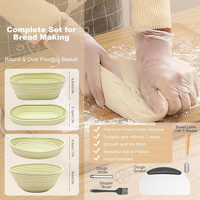 - 【Complete Set for Bread Making】 Banneton Bread Proofing Baskets Set contains one 9-Inch Round and one 10-Inch Oval sourdough baskets, along with 5 other baking essential tools. 1 Silicone Brush, 1 Dough Scraper, 1 Bread Lame with 5 Extra Blades and blade cover and 1 Danish Dough Whisk are included. You don't need to spend time shopping around for other accessories.