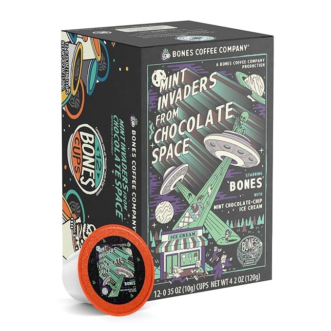 Bones Coffee Company Mint Invaders, Mint Chocolate Chip Flavored Coffee Pods, Low Acid Medium Roast Single-Serve Bones Cups, Compatible with Capsule Brewers Coffee Maker, 12 Count