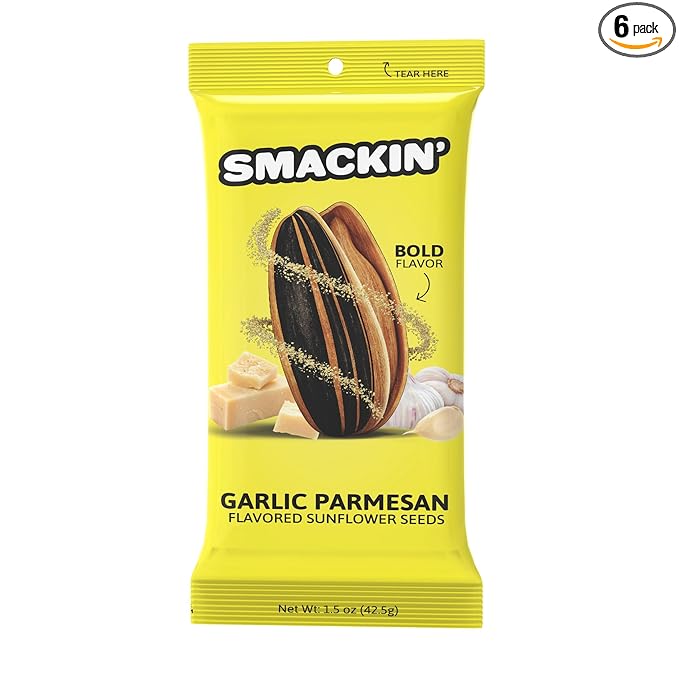 SMACKIN' Sunflower Seeds | Roasted Jumbo Sunflower Seeds | 6 Flavor Sampler Pack | 1.5 Ounce Flavored Sunflower Seeds | Small-Batch, American Made Sunflower Seeds | Keto Snacks (6 Bags, Garlic Parmesan)