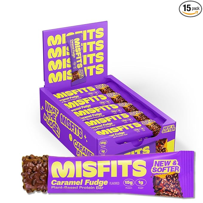 Misfits Vegan Protein Bars, Caramel Fudge - Updated Recipe | Plant Based, Low Sugar & Carb, High Fiber Snacks | Pack of 15