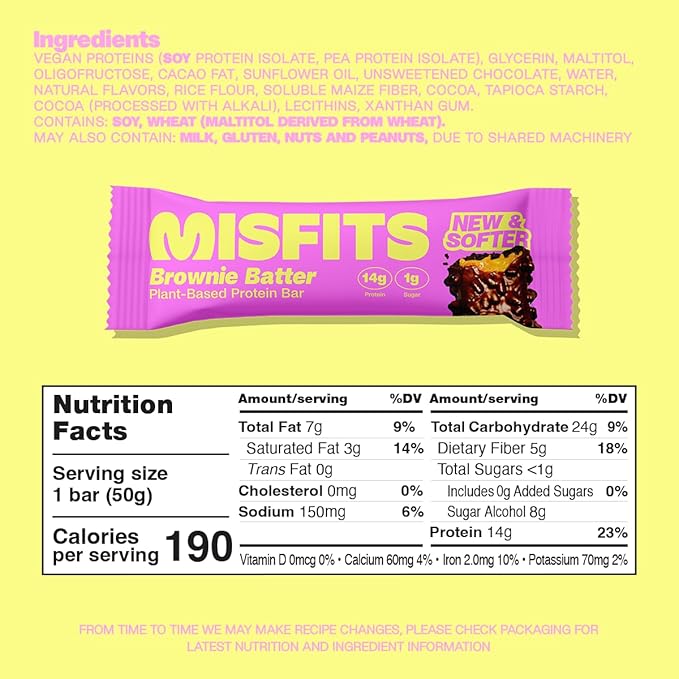 Misfits Vegan Protein Bars, Brownie Batter - Updated Recipe | Plant Based, Low Sugar & Carb, High Fiber Snacks | Pack of 15