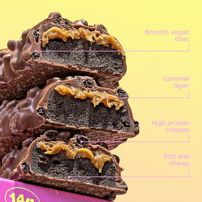 - HEALTHIER CHOCOLATE SNACK: A chewy & fudgy cocoa-rich brownie flavored center, topped with a layer of indulgent caramel & coated with smooth vegan chocolate & high protein crispy pieces, for a satisfying crunch; ideal on-the-go or office snacks