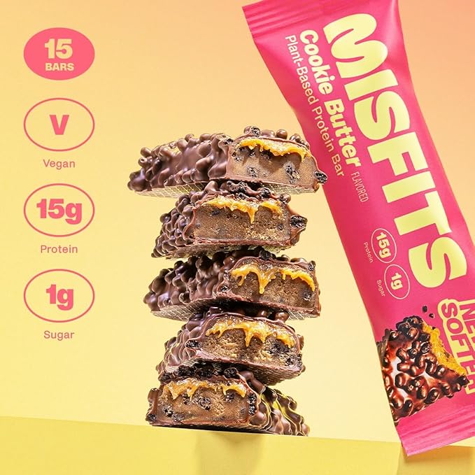 Misfits Vegan Protein Bars, Cookie Butter - Updated Recipe | Plant Based, Low Sugar & Carb, High Fiber Snacks | Pack of 15