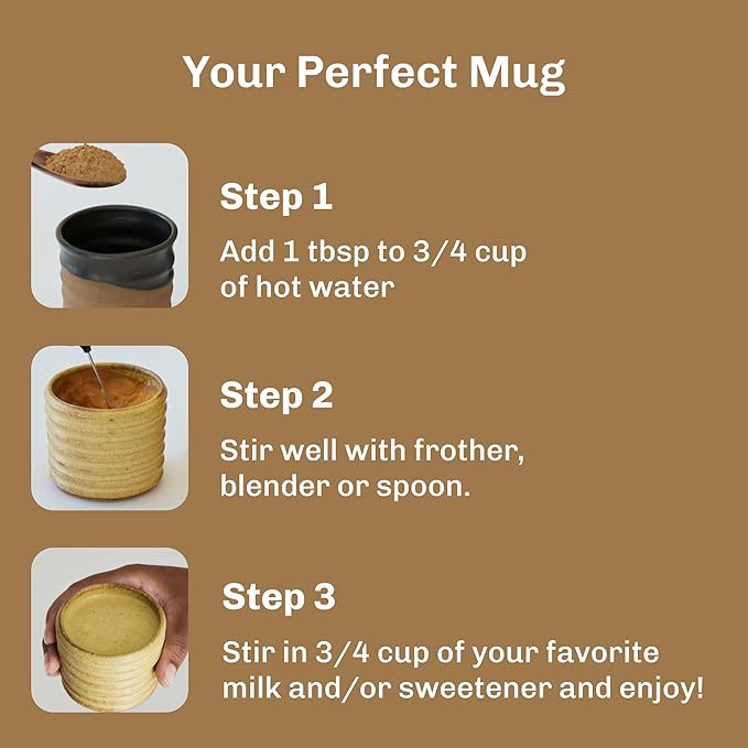 - SO WHAT DOES IT TASTE LIKE? - We're different, so expect a different flavor from Turmeric to everything else on the market! It goes like this: Radiant ginger & turmeric pairs with warm rooibos chai. This is a bold and fiery mushroom coffee mix that tastes like golden hour at sunset! We also pack in 1840mg of your favorite Functional & Adaptogenic Mushrooms (Chaga, Reishi, Lion's Mane and Cordyceps Mushrooms) alongside an organic spice blend (Cinnamon, Turmeric, Ginger, Cardamom, Black Pepper)