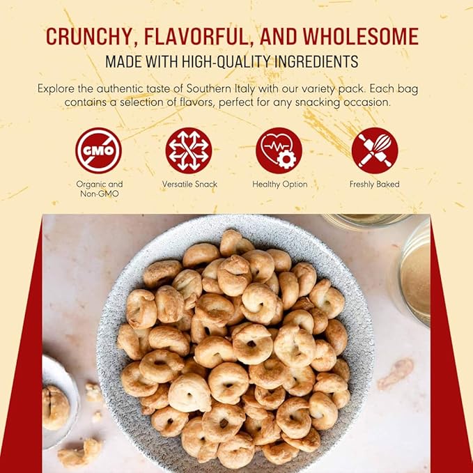 - GENUINE ITALIAN FLAVOR: Our classic tarallini variety pack offers an authentic taste of Southern Italy, capturing the taste of traditional Italian snacks with every bite. Our tarallini are backed using a special recipe passed down through generations, ensuring a truly genuine flavor experience.