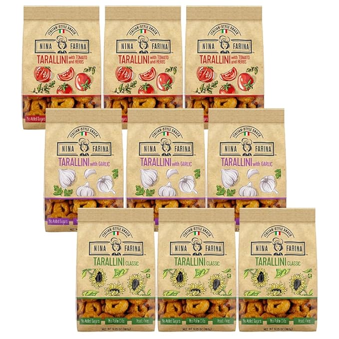 NINA FARINA Tarallini Variety Pack-Fresh Baked Italian Crackers Free from Added Sugars, Palm Oils & Yeast - Italian Style Nutritious Tarallini Crackers Great for Health 6.35oz/bag (9PACK)
