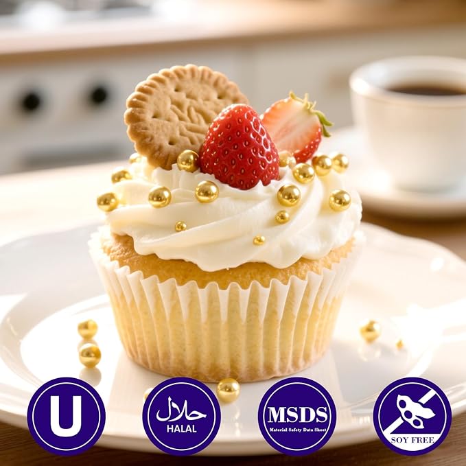 - Gold Sprinkles with food-grade raw materials. Preservative Free, Nut Free, Dairy Free, Chemical Free, Soy Free, Non-GMO. Produced using food-safe standards, the process does not come into contact with allergenic substances and uses Tamper-proof food label. Have Kosher and Halal Certification.