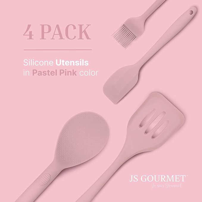Silicone Utensils 4-Piece Set ??Rubber Spatula, Pastry Brush, Slotted Turner, and Rice Paddle ??Complete Heat-Resistant Set for Non-Stick Cookware ??Kitchen Tools for Cooking and Baking ??Pastel Pink