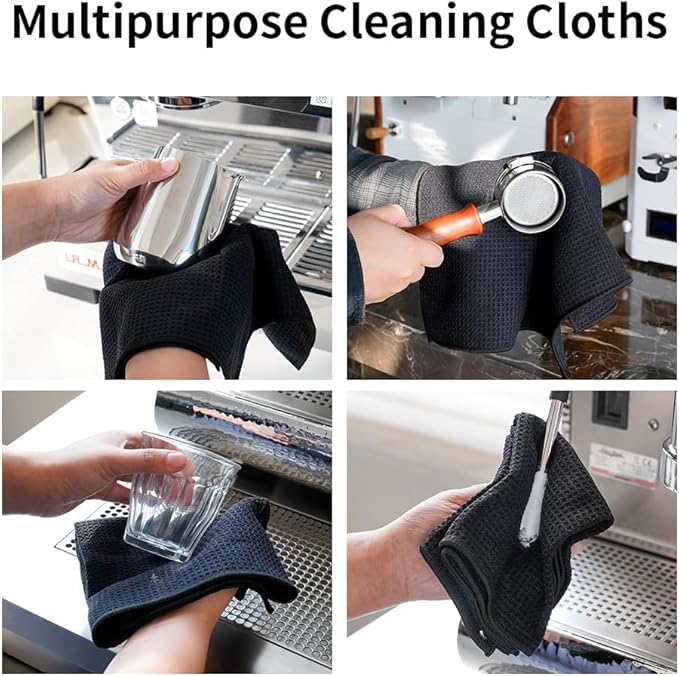 - MULTIPURPOSE MICRO CLOTH: It can be used to clean the coffee bar countertop, steam wand, portafilter, tamper, mugs and etc. Can also be used as tea towel and dish towel for your tableware clean and dry.