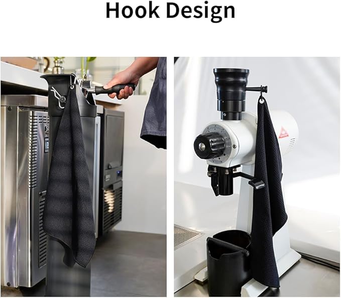 - BARISTA TOWEL WITH HOOK: Engineered for long-lasting use, this sturdy metal hook ensures you never have to worry about sudden breaks or failures. Its versatile design allows for easy attachment to coffee grounds bins, belts, work aprons, or coffee machines, providing convenient and reliable access wherever you need it. Perfect for both home and professional use!