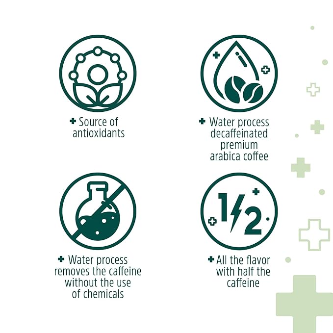 - All the flavor with half the caffeine, rich source of antioxidants, Swiss Water process decaffeinated premium arabica coffee, Swiss Water process removes the caffeine without the use of chemicals