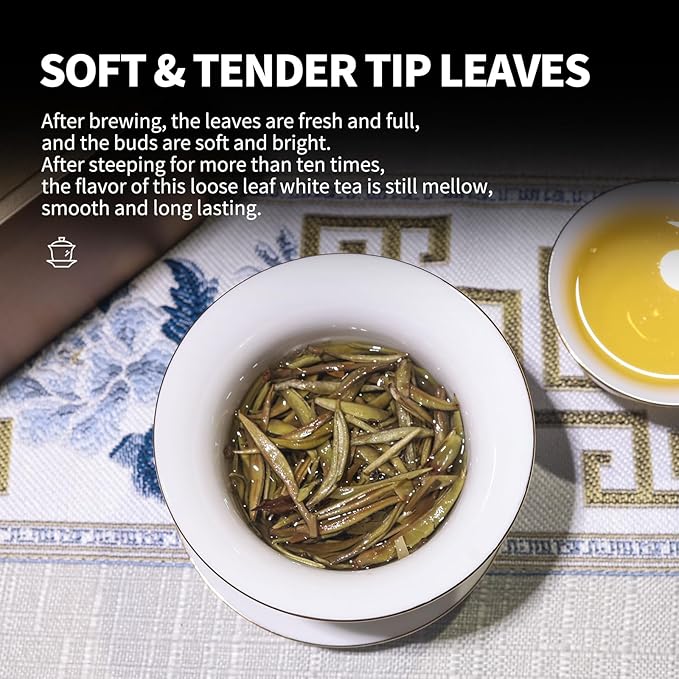 - WONDERFUL AROMA & TASTE --- The premium silver needle white tea leaf is well-balanced, with dense silver hoar and full buds. After brewing, the soup color is clean and translucent without impurities. The leaves are fresh and full, and the buds are soft and bright. The flavor is fresh and refreshing, with a rich floral aroma.