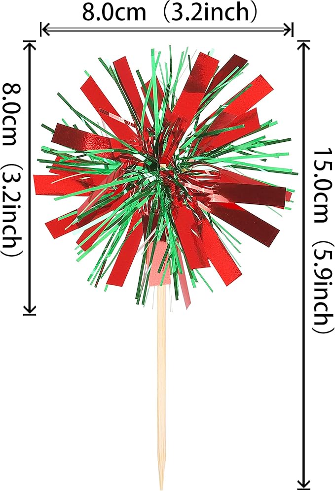 30 PCS Foil Firework Cupcake Toppers Sparkle Tinsel Cupcake Picks Happy Birthday Cake Decorations Drink Stirrers Cocktail Food Fruit Toothpicks for Baby Shower Graduation Party Supplies Red Green