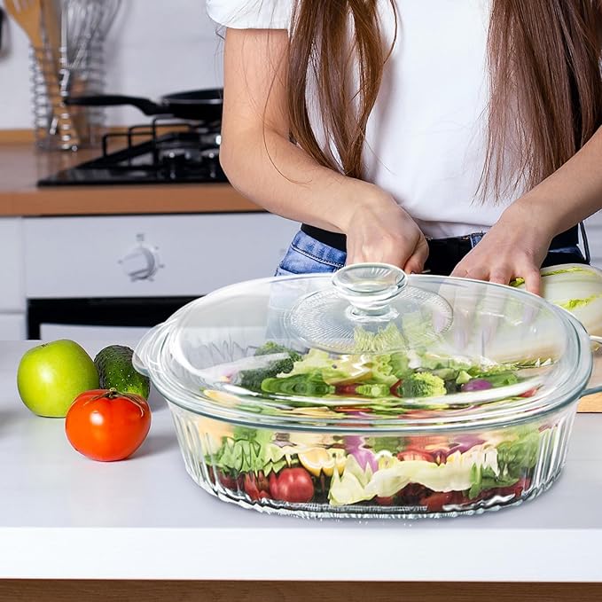 Luvan 2.8L/3Qt Glass Casserole Dish with Lid, Ribbed Oval Glass Baking Dish for Oven & Microwave, Clear Lead-Free Covered Casserole Cookware, Versatile Deep Glasses Food Container for Baking, Cooking