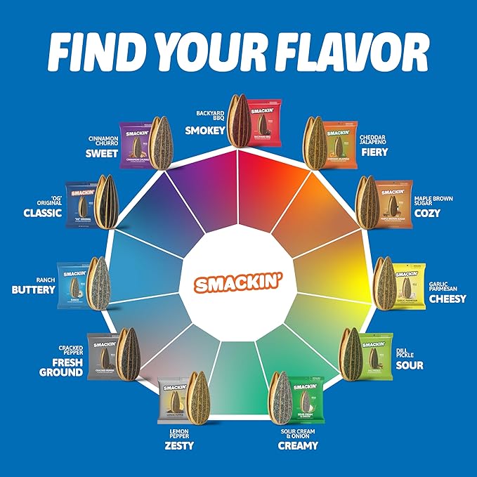 - GET SMACKIN': The classic sunflower seed reimagined with bold flavors, jumbo sunflower seeds and no more salty burn. Every small-batch of hand crafter sunflower seeds is coated in gourmet seasoning and finished with a signature roast.