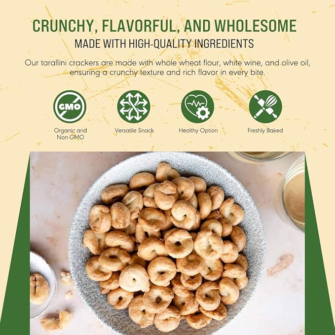 - GENUINE ITALIAN FLAVOR: Our classic tarallini offers an authentic taste of Southern Italy, capturing the taste of traditional Italian snacks with every bite. Our tarallini are backed using a special recipe passed down through generations, ensuring a truly genuine flavor experience.
