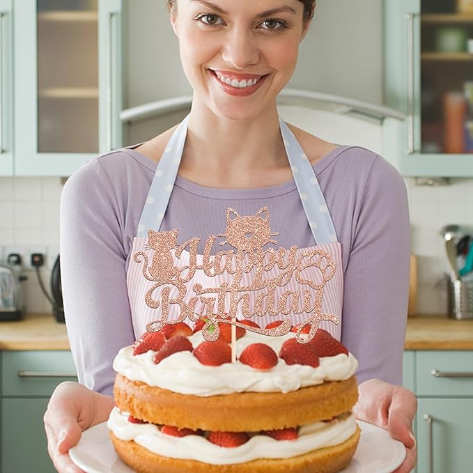 1 Pack Cat Happy Birthday Cake Topper Glitter Black Lovely Cat Cupcake Food Picks Cat Lover Kitten Pet Theme Baby Shower Kids Birthday Wedding Party Cake Decoration Supplies Rose Gold
